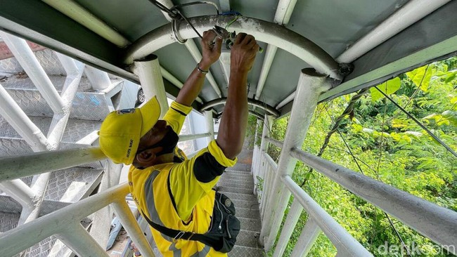Jakarta - Pasukan kuning dari Suku Dinas Bina Marga Jakarta Barat melakukan perawatan JPO Daan Mogot. Perawatan yang dilakukan yakni mengganti lampu penerangan di JPO.
