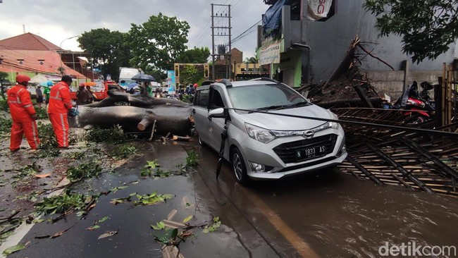 Malang - Pohon tumbang dan menimpa sebuah mobil terjadi di Jalan Sunandar Priyo Sudarmo, Kota Malang. Bagian belakang mobil tampak ringsek.