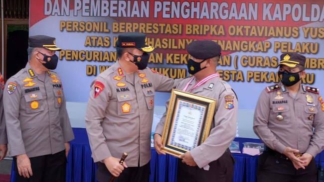 Bripka Oktavianus, anggota Polsek Tenayan Raya, diberi penghargaan dari Kapolda Riau Irjen Mohammad Iqbal, karena aksi heroik ringkus jambret perampas ponsel seorang ibu di Riau.
