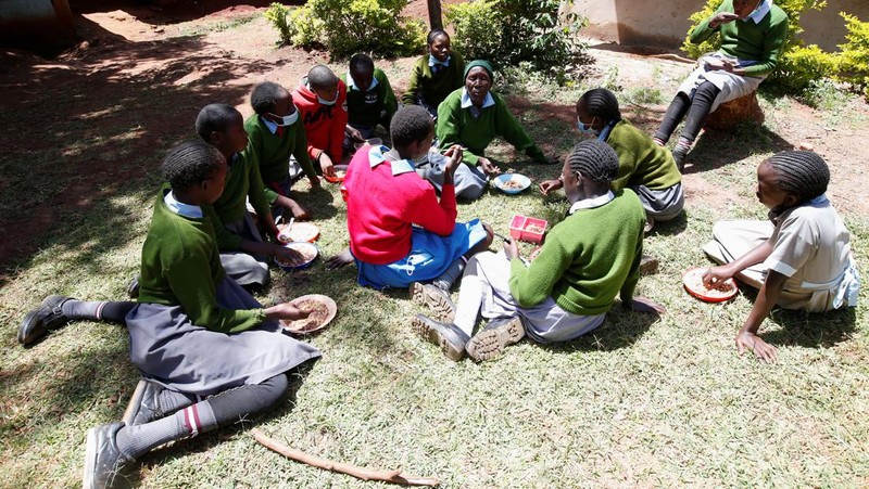 Priscilla Sitienei, seorang siswa sekolah dasar berusia 98 tahun di kelas enam, dibantu untuk menyesuaikan seragam sekolahnya oleh guru di Leaders Vision Preparatory School, desa Ndalat, Kabupaten Nandi, Kenya.