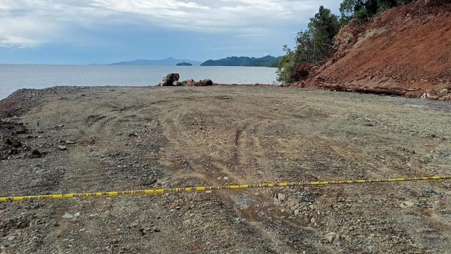 Garis polisi tampak terpasang di area penambangan liar di lokasi Jety PT. TMM yang berada di Desa Lelemawu san desa Mosiku, Kecamatan Batu Putih, Sulawesi Tenggara, Kamis (10/2/2022).
