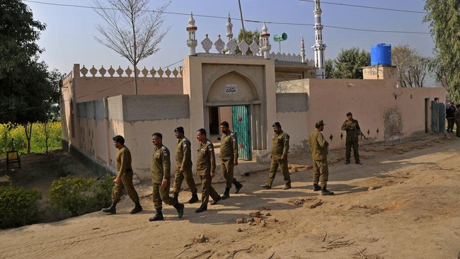 Polisi berjaga di luar masjid yang menjadi awal kejadian perkara di desa Tulamba, distrik Khanewal, Pakistan, Minggu (13/2/2022). Juru bicara pemerintah mengatakan, lebih dari 60 orang ditangkap. Ia juga menyampaikan, jumlah tersangka terus bertambah setelah memeriksa rekaman media sosial milik warga.