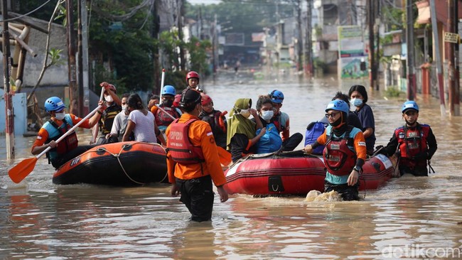 Bekasi - Perumahan Pondok Gede Permai jadi salah satu area yang terdampak banjir di Bekasi. Banjir yang cukup tinggi menyebabkan warga di perumahan ini dievakuasi.