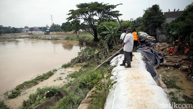 Bekasi - Jebolnya tanggul sementara bronjong sebabkan Perumahan Pondok Gede Permai, Kota Bekasi, terendam banjir. Kini petugas dikerahkan untuk memperbaiki tanggul itu.