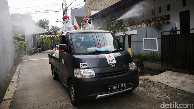 Bekasi - Penambahan kasus COVID-19 harian di Jabar terus meningkat. PMI pun gencar melakukan penyemprotan disinfektan di permukiman warga Kota Bekasi.