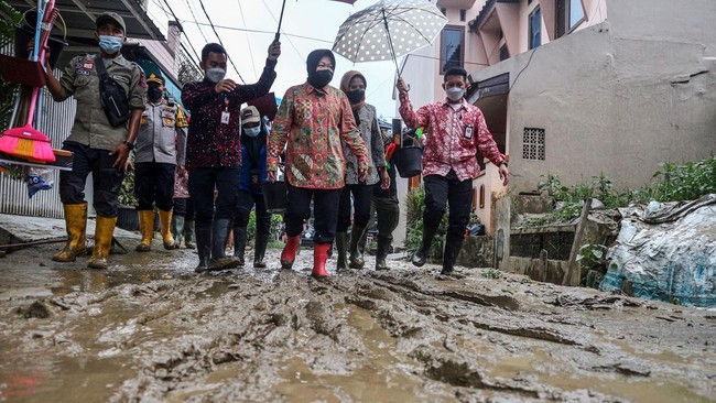 Risma Becek-becekan Tinjau Banjir di Gunung Putri Bogor