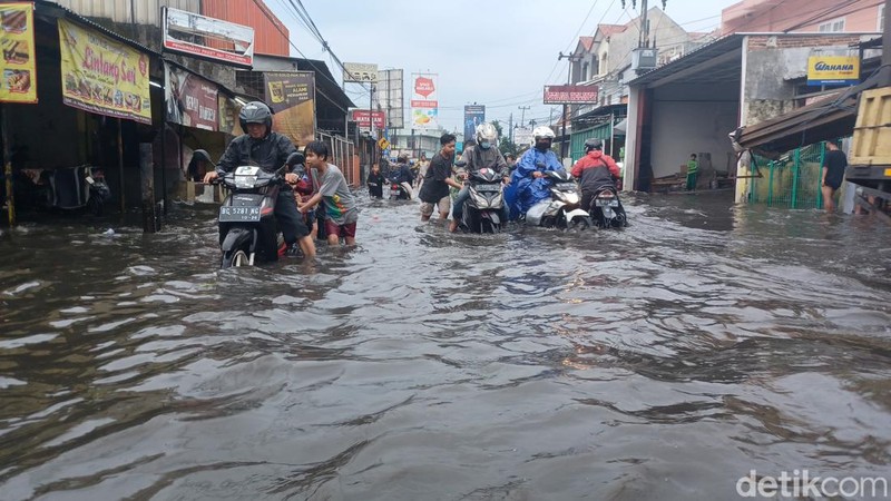 Pantauan detikcom di lokasi sekitar pukul 17.00 WIB, lalu lintas kendaraan tersendat. Sejumlah kendaraan roda dua dan empat memaksakan menerobos genangan banjir tersebut.