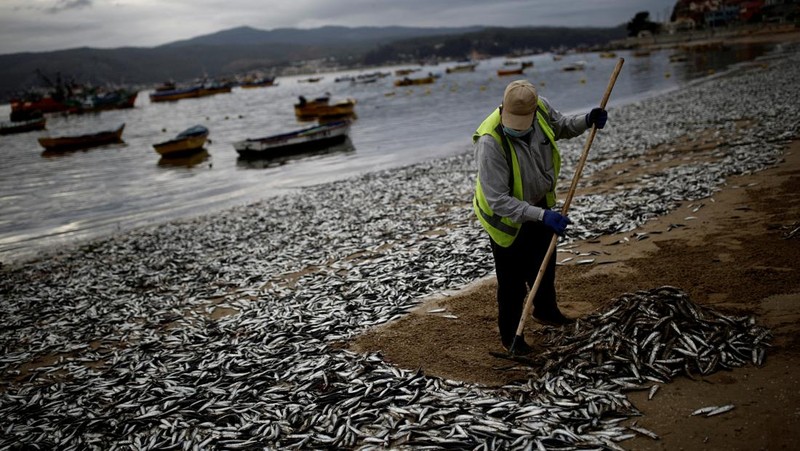 Seorang pekerja memindahkan ikan sarden mati yang terdampar di tepi pantai Coliumo dekat Concepcion, Chili 20 Februari 2022.