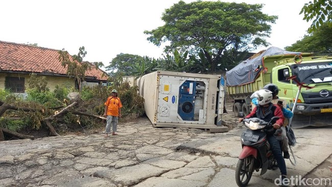 Tangerang - Truk kontainer terbalik di Jalan Raya Perancis, Benda, Kota Tangerang. Diduga truk mengalami kecelakaan karena tak stabil melintas di jalan yang rusak.
