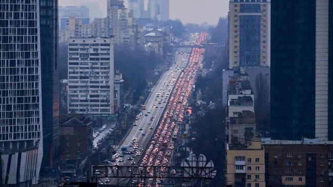 Ukraina - Rusia memulai serangan besar-besaran di Ukraina. Warga pun berbondong-bondong meninggalkan wilayah yang memanas dengan kendaraan mereka.