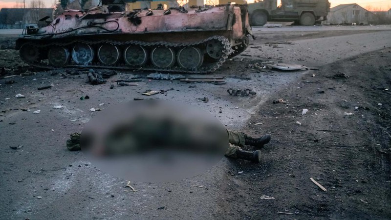 Seorang tentara tanpa lencana yang diklaim militer Ukraina sebagai prajurit Rusia tewas dalam pertempuran dan tergeletak di sebuah jalan di luar kota Kharkiv, Ukraina, 24 Februari 2022. REUTERS/Maksim Levin.