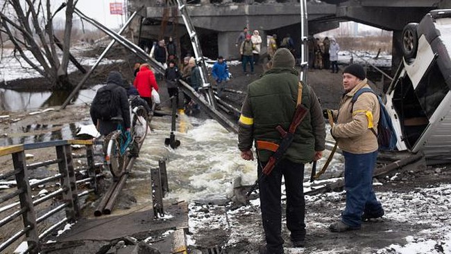 Ukraina - Warga Ukraina berbondong meninggalkan Ibu Kota, Kiev untuk mencari tempat perlindungan. Mereka pun melintasi jembatan yang hancur akibat ledakan.
