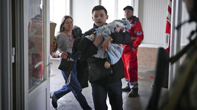 Pria di Mariupol, Ukraina, menggendong seorang anak yang terluka parah akibat tertembak di tengah invasi Rusia ke Ukraina pada Jumat (4/3/2022).
