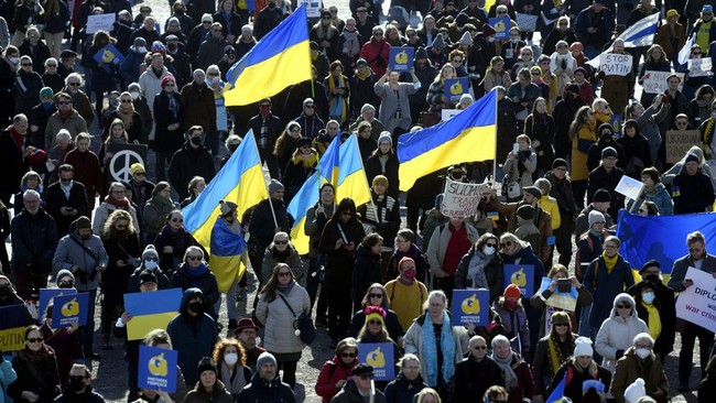 Finlandia - Unjuk rasa menolak invasi Rusia ke Ukraina terus terjadi di sejumlah negara. Salah satunya di Helsinki, Finlandia.