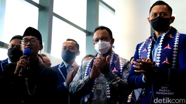 Ketua Umum (Ketum) Partai Demokrat Agus Harimurti Yudhoyono (AHY) dan Gubernur DKI Jakarta Anies Baswedan tampak menghadiri acara Partai Demokrat di JIExpo, Kemayoran, Jakarta, Selasa (15/3/2022).