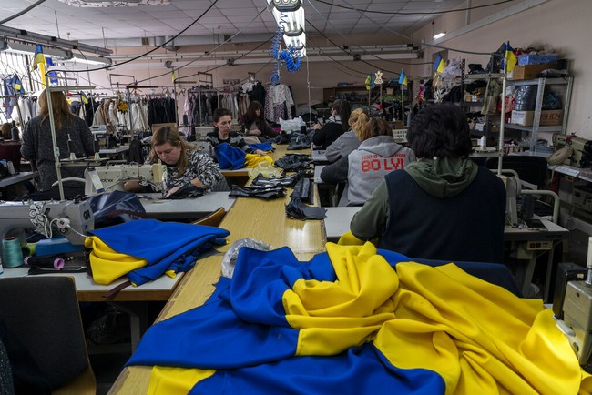 Ukraina - Relawan menjahit bendera nasional di Lviv, Ukraina. Meski terlihat sederhana, bendera ini yang menghidupkan semangat kebangsaan dan bikin Rusia kewalahan.