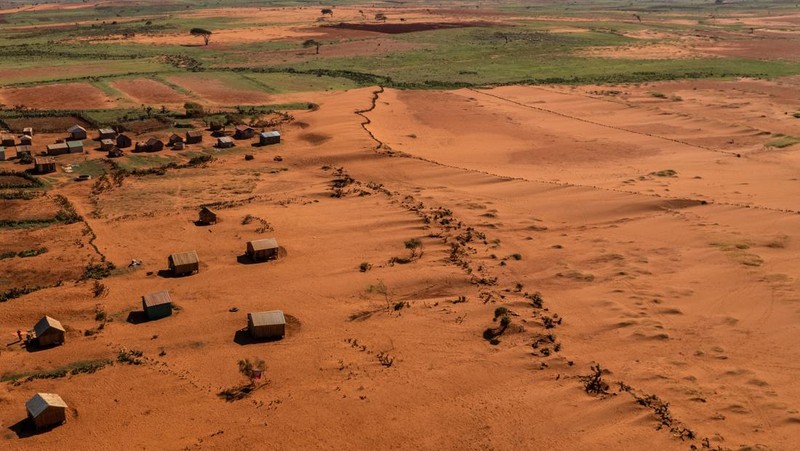 Dengan sedikit pohon yang tersisa untuk memperlambat angin di sudut selatan Madagaskar yang dulu subur ini, pasir merah bertiup ke mana-mana: ke ladang, desa dan jalan, dan ke mata anak-anak yang menunggu paket bantuan makanan.