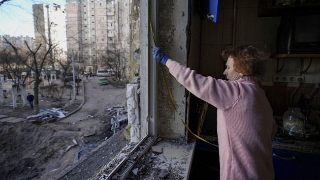 Seorang wanita mengukur jendela sebelum menutupinya dengan lembaran plastik di sebuah gedung yang rusak akibat bom di Kyiv, Ukraina, Senin (21/3/2022) waktu setempat. (AP/Vadim Ghirda)