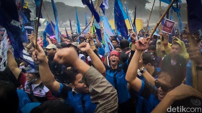 Jakarta - Massa buruh menggelar unjuk rasa di depan Gedung DPR RI, Jakarta. Meski diguyur hujan deras, mereka tetap semangat menuntut pencabutan UU Cipta Kerja.