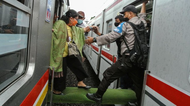 Petugas membantu penumpang KRL Commuterline berpindah rangkaian kereta di kawasan Cipinang, Jakarta Timur, Rabu (23/3/2022).