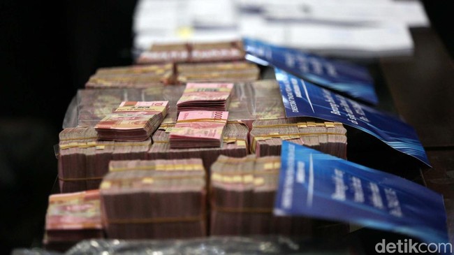 Jakarta - Polisi menyita barang bukti dari tersangka affiliator Binomo Indra Kenz. Tumpukan duit serta mobil Tesla turut dihadirkan di Bareskrim Polri, Jakarta.