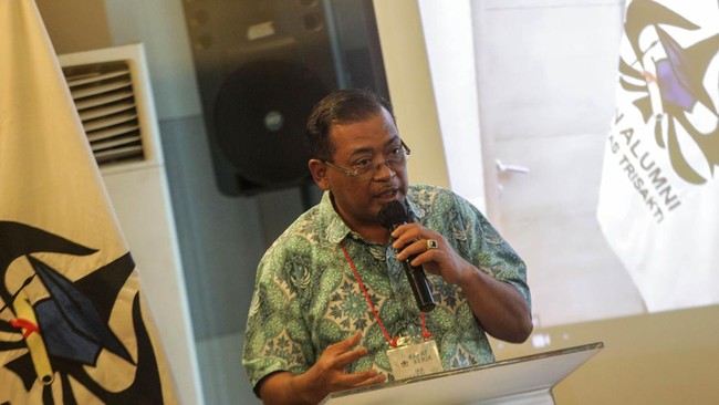 Ketua Umum Ikatan Alumni Universitas Trisakti (IKA Usakti) Donny Yoesgiantoro memberikan sambutan Rapat Kerja Nasional (Rakernas) untuk membahas berbagai program kerja dari seluruh bidang dan pengurus pusat Ika-Usakti periode 2021-2025 di Jakarta, Sabtu (26/3).