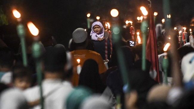 Jakarta - Warga menggelar pawai obor di kawasan Matraman Dalam, Jakarta. Pawai obor tersebut dalam rangka menyambut bulan suci Ramadhan 1443 Hijriah.