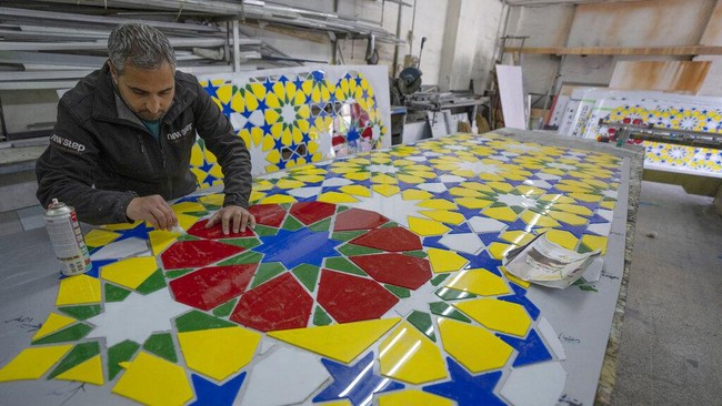 Seorang pengrajin Palestina mengerjakan bagian monumen bergaya Islam yang terdiri dari lentera dan bulan sabit, dua ikon simbolis bulan suci Ramadan, di kota Ramallah, Tepi Barat, Selasa, (29/3/2022).