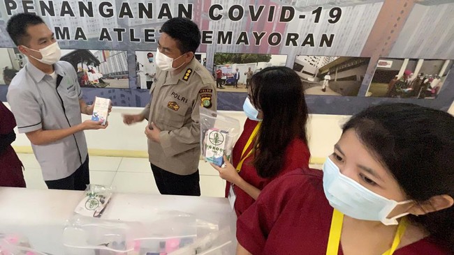Jakarta - Tenaga kesehatan dan pasien Covid-19 di RSDC Wisma Atlet menerima donasi alat kesehatan. Donasi ini untuk membantu para Nakes tetap sehat selama bekerja.