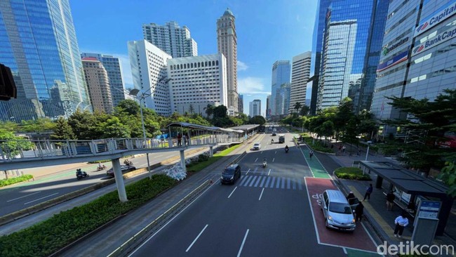 Jakarta - Pada H-1 Ramadan, suasana di Jalan Sudirman-MH Thamrin, Jakarta Pusat, terihat lengang, Sabtu (2/4/2022). Begini potretnya.