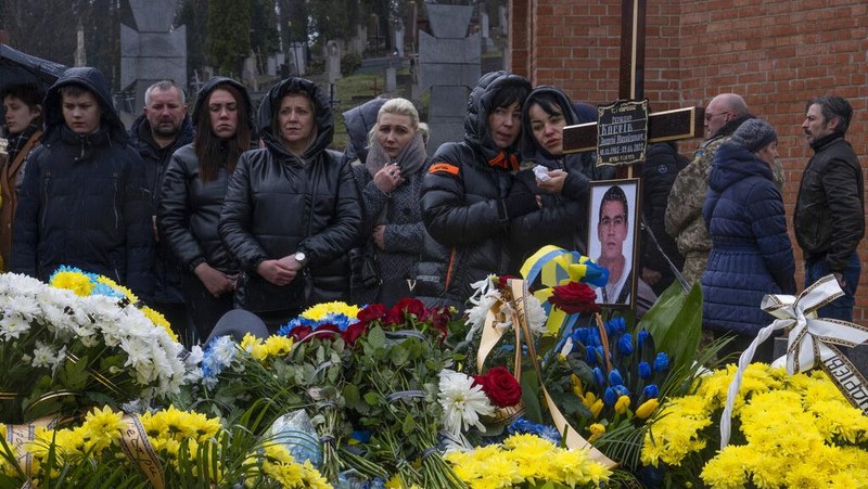 Keluarga dan teman menghadiri pemakaman sersan Kostiv Andrew berusia 37 tahun, yang tewas dalam aksi, di pemakaman Lychakiv, di Lviv, Ukraina barat, Selasa, (5/4/2022). (AP Photo/Nariman El-Mofty)