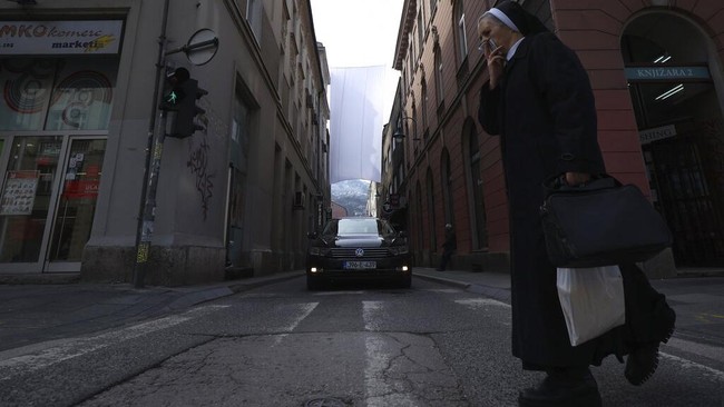 Seorang biarawati Katolik berjalan melewati kain yang mewakili layar perlindungan penembak jitu yang dipajang di pusat kota di Sarajevo, Bosnia, Senin, 4 April 2022.