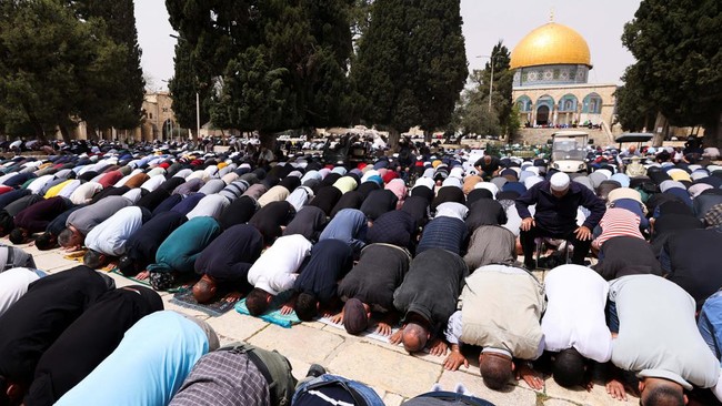 Palestina - Warga Palestina melaksanakan salat Jumat pertama bulan Ramadan tahun 2022 di Kompleks Masjid Al Aqsa. Begini suasananya.