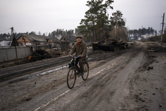 Ukraina - Sepeda menjadi andalan penduduk untuk bepergian secara terbatas di tengah perang Ukraina. Melewati reruntuhan maupun tank yang hancur. Tak ada senyum terlintas.