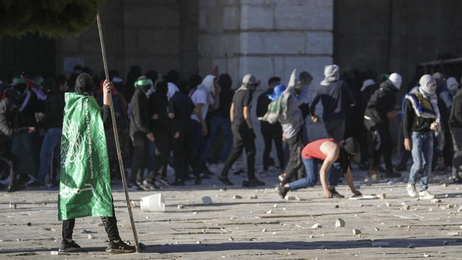 Warga Palestina bentrok dengan pasukan keamanan Israel di kompleks Masjid Al Aqsa di Kota Tua Yerusalem, Jumat (15/4/2022). AP Photo/Mahmoud Illean