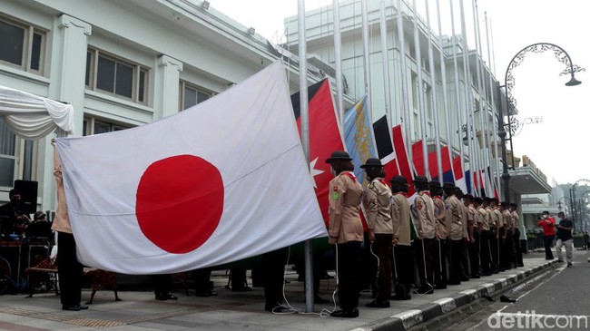 Bandung - Sebanyak 109 bendera berbagai negara dunia dikibarkan di Gedung Merdeka, Bandung. Pengibaran bendera dalam rangka peringatan ke-67 Konferensi Asia Afrika (KAA).