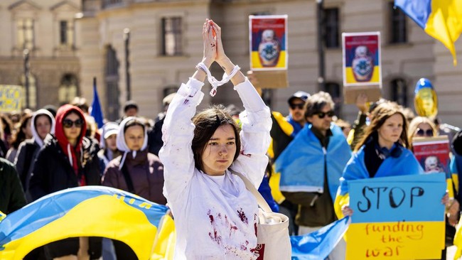 Jerman - Kateryna (23) yang melarikan diri dari Odessa, Ukraina, ikut aksi menolak invasi Rusia ke Ukraina. Kateryna tampak memakai kemeja dengan noda 'darah'.