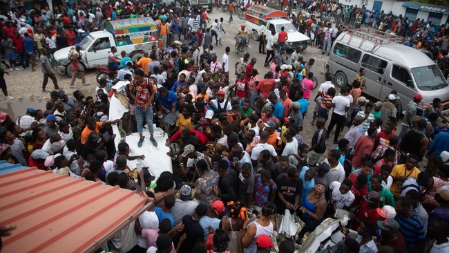 Warga berkumpul untuk melihat puing pesawat yang jatuh di kawasan Port-au-Prince, Haiti, Rabu (20/4/2022) waktu setempat.