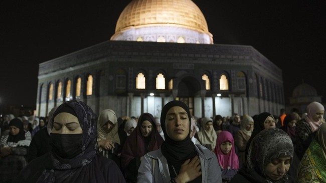 Sejumlah umat muslim Palestina berkumpul di kompleks Masjid Al-Aqsa untuk menyambut malam Lailatul Qadar, Rabu (27/4/2022) waktu setempat. (AP Photo/Mahmoud Illean).