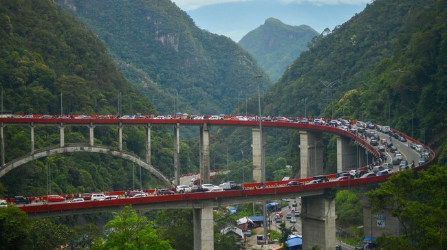 Sumatera Barat - Kondisi arus balik di Fly Over Kelok Sembilan terpantau macet. Jembatan ikonik di Sumatera Barat itu dipadati pengendara sejak pagi hingga malam.