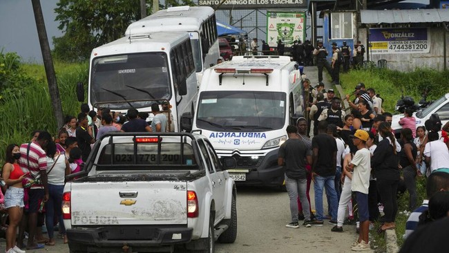 Ambulans meninggalkan penjara tempat kerusuhan maut di Santo Domingo de los Tsachilas, Ekuador, Senin (9/5/2022) waktu setempat.