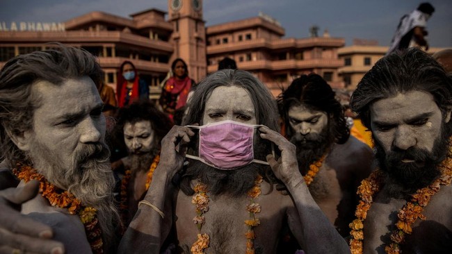 Seorang 'Naga Sadhu', atau orang suci Hindu, memasang masker di wajahnya sebelum memasuki sungai Gangga selama Shahi Snan tradisional, atau saus kerajaan, di festival Kumbh Mela di Haridwar, India, 12 April 2021. Kasus COVID- 19 membuat kematian meledak di India pada bulan April dan Mei, rumah sakit kehabisan oksigen sehingga banyak pasien mati lemas. REUTERS/Danish Siddiqui