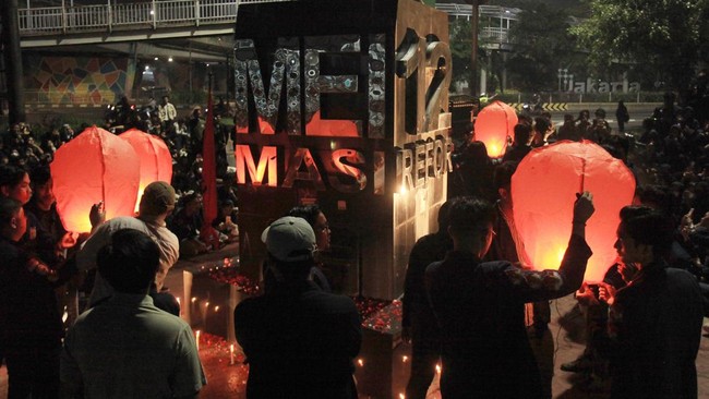Jakarta - Mahasiswa Trisakti melakukan tabur bunga saat aksi malam gelora di Tugu 12 Mei Reformasi. Hal ini dilakukan untuk menghormati 4 korban yang meninggal.