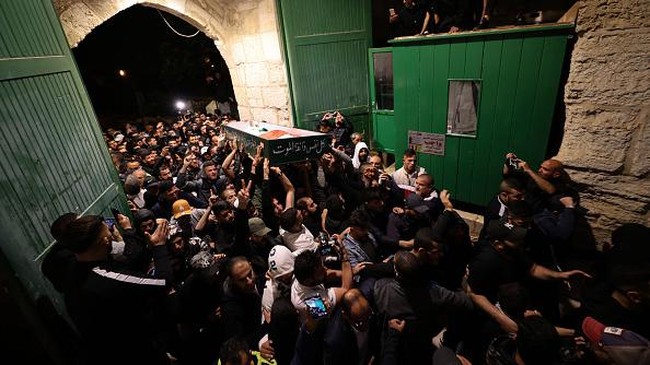 Yerusalem - Seorang pemuda dibunuh pasukan Israel dalam bentrokan di komplek Masjid Al-Aqsa. Usai jenazah dipulangkan, warga Palestina berbondong mengantar ke pemakaman.