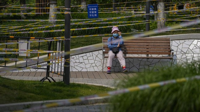 Seorang wanita mengenakan masker duduk di bangku di ruang hijau yang dibarikade dengan pagar dan pita di Beijing, China, Kamis (19/5/2022).
