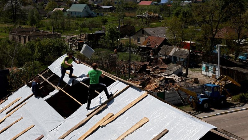 Tampak sebuah keluarga tengah memperbaiki atap toko yang rusak akibat perang Rusia-Ukraina di desa Moshchun, wilayah Kyiv.