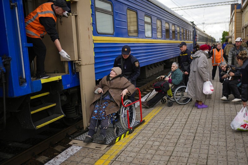 Para lansia mengungsi dari zona perang menggunakan kereta api, di Pokrovs, Ukraina bagian timur, Minggu, (22/5/2022).
