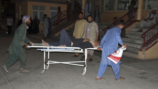Seorang pria yang terluka dibawa ke rumah sakit setelah pemboman di Mazar-e-Sharif, Afghanistan, Rabu (25/5/2022) waktu setempat.