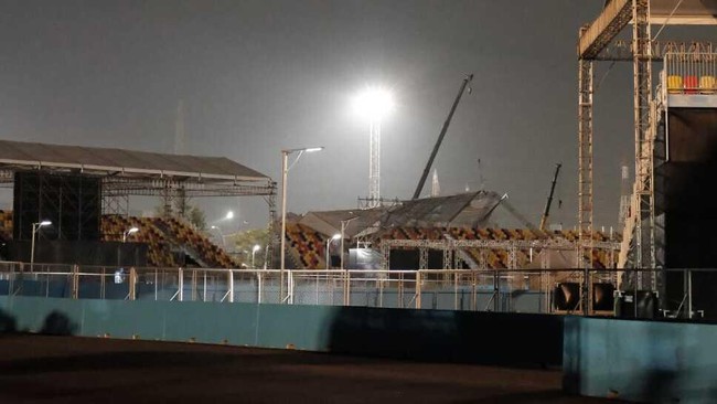 Jakarta - Atap tribun penonton atau grandstand Formula E di Ancol, Pademangan, Jakarta Utara, roboh. Ini foto-fotonya.