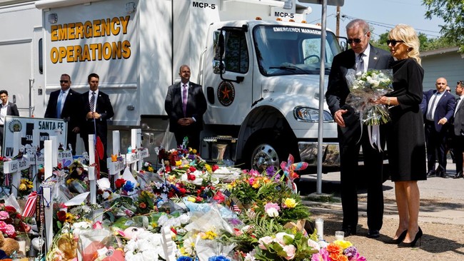 Texas - Presiden Amerika Serikat Joe Biden kunjungi lokasi penembakan SD di Texas. Kedatangannya untuk menyampaikan belasungkawa dan menghibur warga yang berduka.